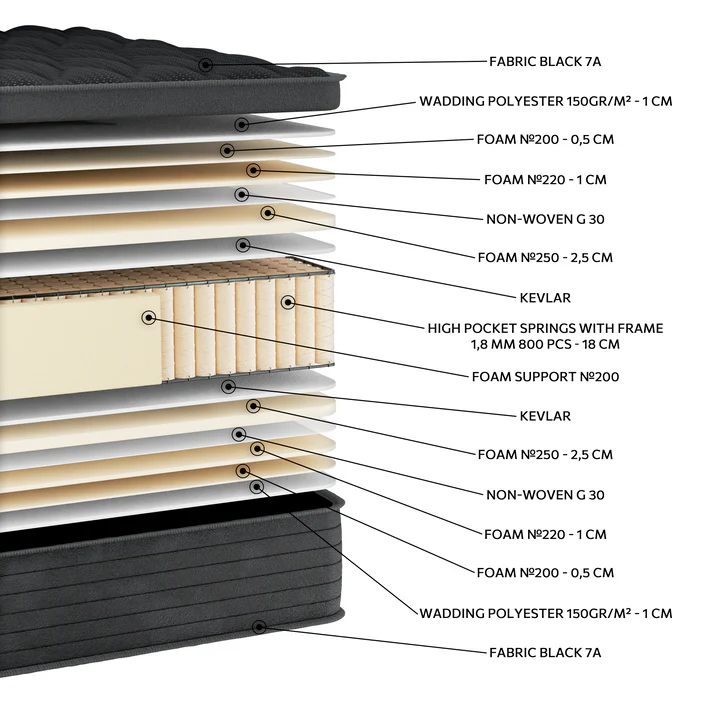 Στρώμα μέτριας προς σκληρής σκληρότητας με υψηλά ελατήρια High Pocket, που προσφέρουν αυξημένη βύθιση και καλύτερη αίσθηση στήριξης. Οι ενισχυμένες στρώσεις αφρού προσφέρουν σταθερότητα και άνεση, ενώ το ύφασμα Black 7A ολοκληρώνει την εμπειρία με μοντέρνα αισθητική και ευχάριστη αίσθηση αφής.