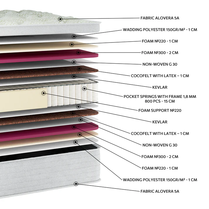 Στρώμα υψηλής σκληρότητας με ανεξάρτητα ελατήρια Pocket που προσφέρουν σταθερή στήριξη και αυξημένη αντοχή. Ο συνδυασμός κοκοφοίνικα με latex ενισχύει τη φυσική ελαστικότητα και τη σωστή διαπνοή, ενώ οι στρώσεις αφρού εξασφαλίζουν σταθερότητα και ομοιόμορφη κατανομή του βάρους. Το ύφασμα Aloe Vera 5A συμβάλλει στη δημιουργία ενός δροσερού και υγιεινού περιβάλλοντος ύπνου. Μια εξαιρετική επιλογή για όσους αναζητούν απόλυτη στήριξη και φυσικά υλικά που ενισχύουν την ανθεκτικότητα και τη διαπνοή του στρώματος.