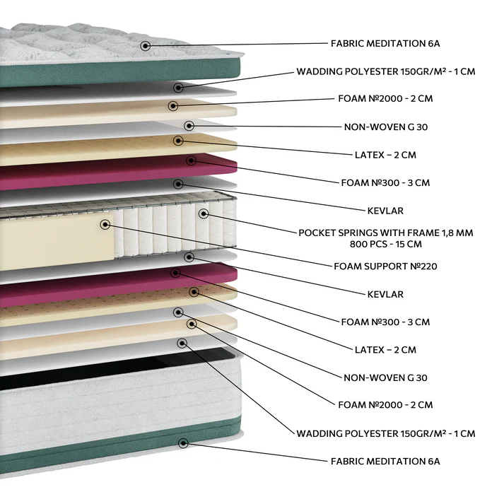 Στρώμα μέτριας σκληρότητας με ανεξάρτητα ελατήρια Pocket, που προσφέρουν προσαρμοσμένη στήριξη και σωστή ευθυγράμμιση του σώματος. Οι στρώσεις από Latex και αφρό υψηλής ποιότητας αγκαλιάζουν το σώμα, μειώνοντας τα σημεία πίεσης και προσφέροντας αίσθηση χαλάρωσης. Το ύφασμα Meditation 6A προσφέρει απαλή υφή και συμβάλλει στη διατήρηση ιδανικής θερμοκρασίας ύπνου. Μια εξαιρετική επιλογή για όσους αναζητούν ισορροπία ανάμεσα στη στήριξη και την άνεση, με φυσική ελαστικότητα και αίσθηση δροσιάς.