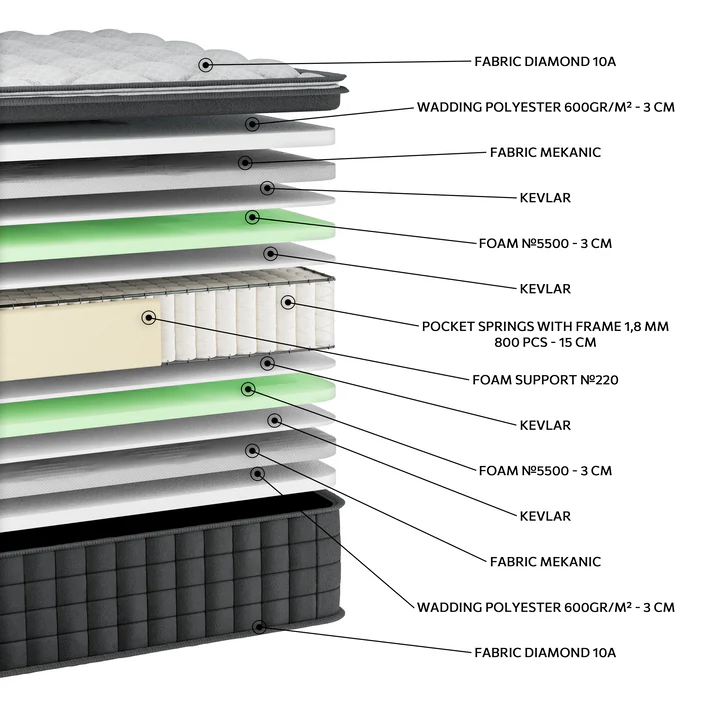 Στρώμα μέτριας σκληρότητας με ανεξάρτητα ελατήρια Pocket, που προσαρμόζονται στο σώμα για στοχευμένη στήριξη και άνεση. Οι στρώσεις από αφρώδη υλικά υψηλής πυκνότητας εξασφαλίζουν σωστή ευθυγράμμιση και ανθεκτικότητα. Η αφαιρούμενη θήκη με φερμουάρ προσφέρει ευκολία στον καθαρισμό, ενώ το ύφασμα Diamond 10A προσθέτει κομψότητα και αίσθηση πολυτέλειας. Μια εξαιρετική επιλογή για όσους επιθυμούν ποιότητα, υγιεινή και ισορροπημένη αίσθηση.