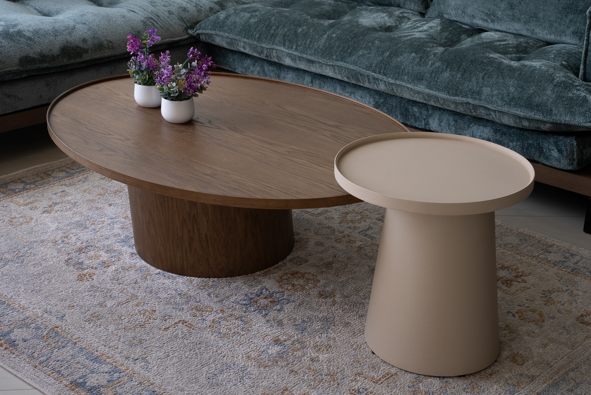 Αυτό το σετ τραπεζιών σαλονιού αποτελεί έναν εκλεπτυσμένο συνδυασμό υλικών και αισθητικής, που ισορροπεί αρμονικά ανάμεσα στη ζεστασιά του φυσικού ξύλου και τον σύγχρονο χαρακτήρα του μετάλλου και του τσιμέντου. Το κύριο τραπέζι, με οβάλ επιφάνεια από δρυ, ξεχωρίζει για τη λιτή γεωμετρική του γραμμή και τη στιβαρή κυλινδρική βάση του, ενώ προσφέρεται με δυνατότητα επιλογής απόχρωσης ξύλου, ώστε να προσαρμόζεται σε κάθε χώρο.