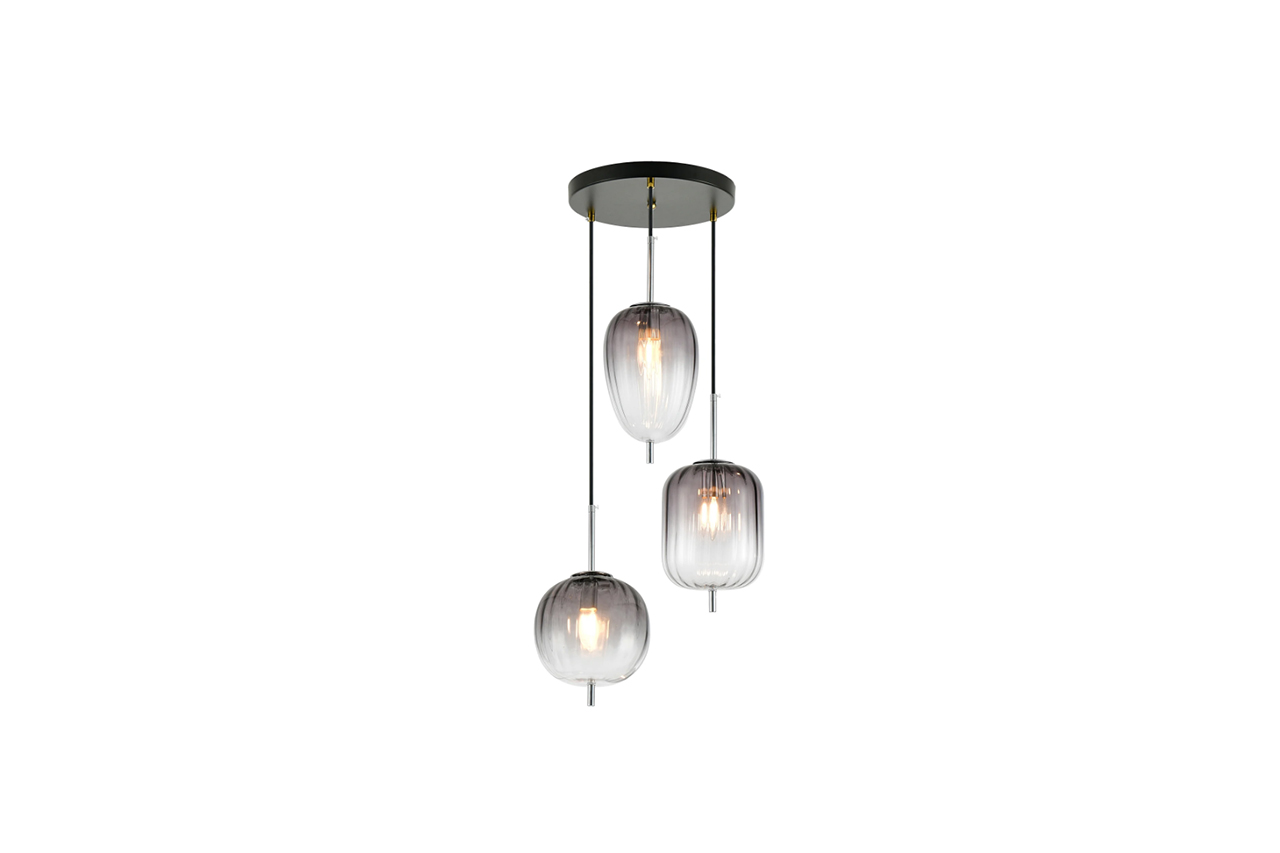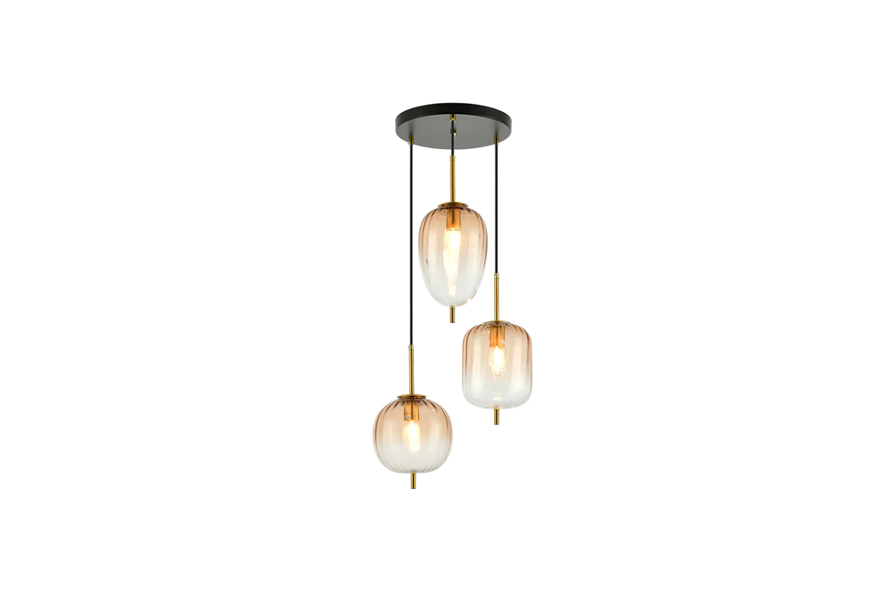 Εντυπωσιακό 3φωτο κρεμαστό φωτιστικό με μεταλλικό μαύρο σκελετό και με γυαλιά ντεγκραντέ σε 2 χρώματα.