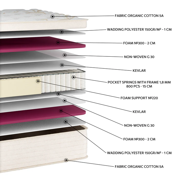 Στρώμα μέτριας προς σκληρής αίσθησης με ανεξάρτητα ελατήρια Pocket, που προσαρμόζονται στο σώμα προσφέροντας εξατομικευμένη στήριξη και σταθερότητα. Οι στρώσεις αφρού  εξασφαλίζουν ομοιόμορφη κατανομή βάρους και ανθεκτικότητα. Το ύφασμα Organic Cotton 5A χαρίζει φυσική απαλότητα και συμβάλλει στη σωστή κυκλοφορία του αέρα για έναν πιο υγιεινό ύπνο. Μια εξαιρετική επιλογή για όσους αναζητούν στιβαρή αίσθηση στήριξης και άνεσης.