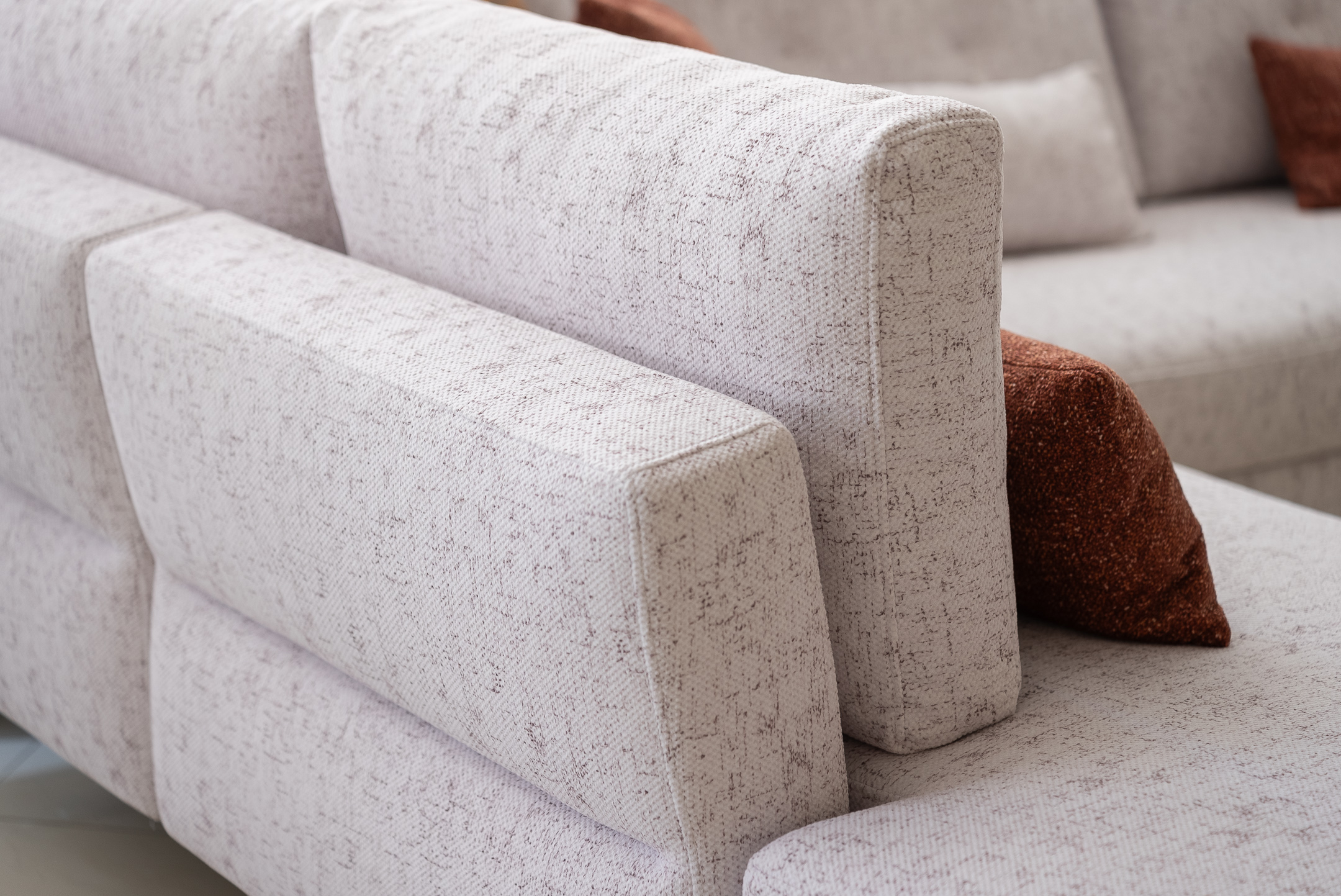 Η ευρύχωρη γωνία προσφέρει άνεση και σωστή στήριξη, ιδανική για στιγμές χαλάρωσης με την οικογένεια ή την παρέα. Η αναπαυτική έδρα και τα αναπαυτικά μαξιλάρια πλάτης αγκαλιάζουν το σώμα, ενώ τα διακοσμητικά μαξιλάρια σε γήινες αποχρώσεις προσθέτουν ζεστασιά και στυλ στον χώρο.