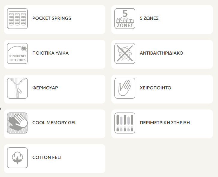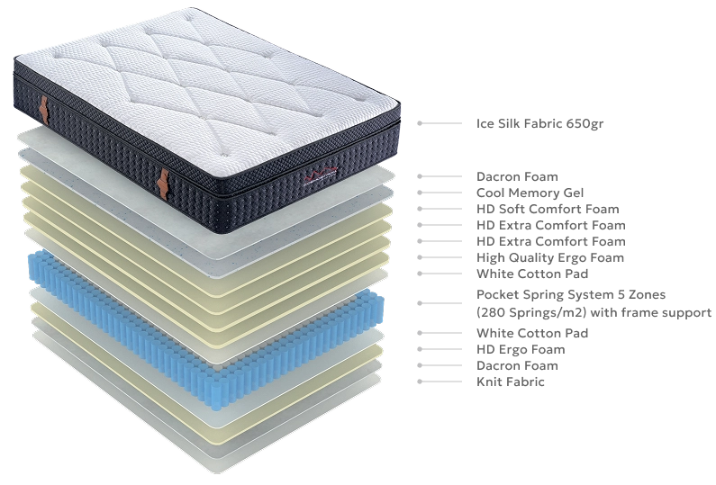 Ο συνδυασμός του Ice cool fabric (με σύνθεση ινών νέας τεχνολογίας) και του Cool Memory Gel για ομοιόσταση της θερμοκρασίας, διατηρεί το στρώμα δροσερό περιορίζοντας την εφίδρωση, χαρίζοντάς σας έτσι έναν απόλυτα χαλαρωτικό ύπνο.